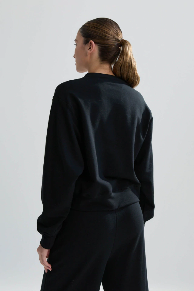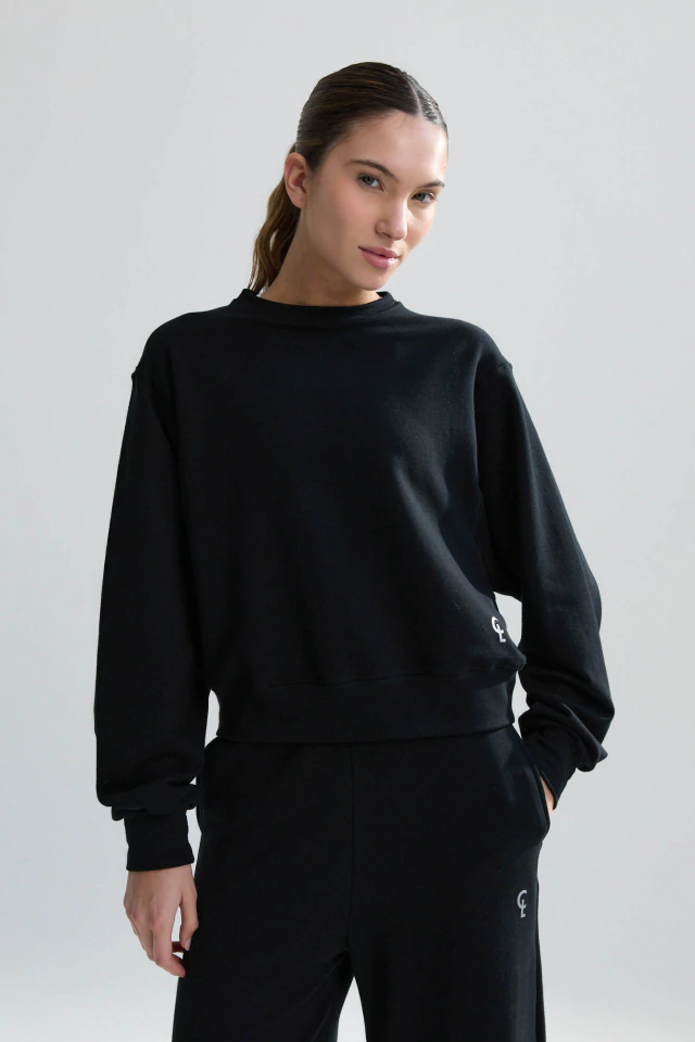 BUZO CORTE CUADRADO CON RECORTES EN LATERALES Y CUELLO REDONDO. CONFECCIONADO EN RÚSTICO. DETALLE DE ESTAMPACIÓN CL.