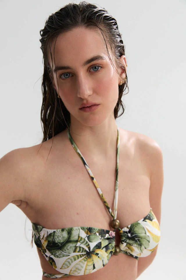 CORPIÑO CON TIRAS REGULABLES. CONFECCIONADO EN TRICOT BRILLANTE ESTAMPADO. BROCHE EN ESPALDA. CON COPAS EXTRAÍBLES.