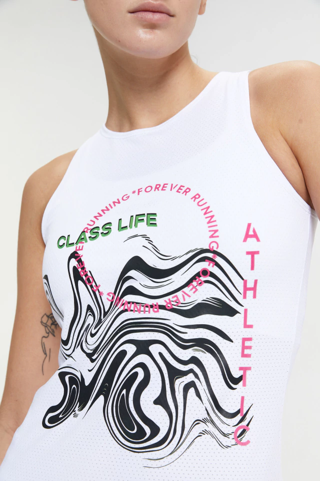 MUSCULOSA DE CUELLO REDONDO AL CUERPO. CONFECCIONADA EN DESAGUJADO. CON ESTAMPA ÚNICA EN DELANTERO.
