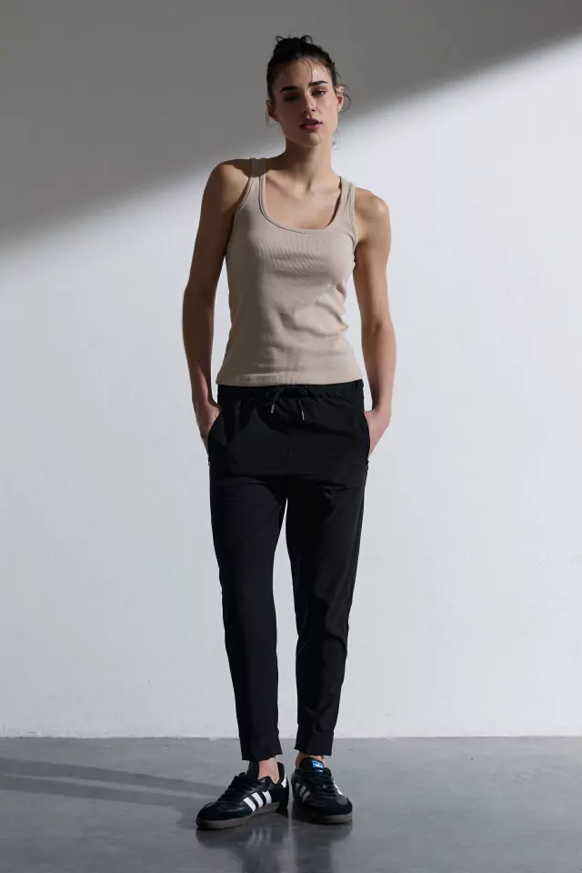 PANTALON TIRO MEDIO CON CORDON AJUSTABLE A TONO. CONFECCIONADO EN TELA LIGERAMENTE ELASTIZADA. BOLSILLOS CON CIERRE EN LATERALES.