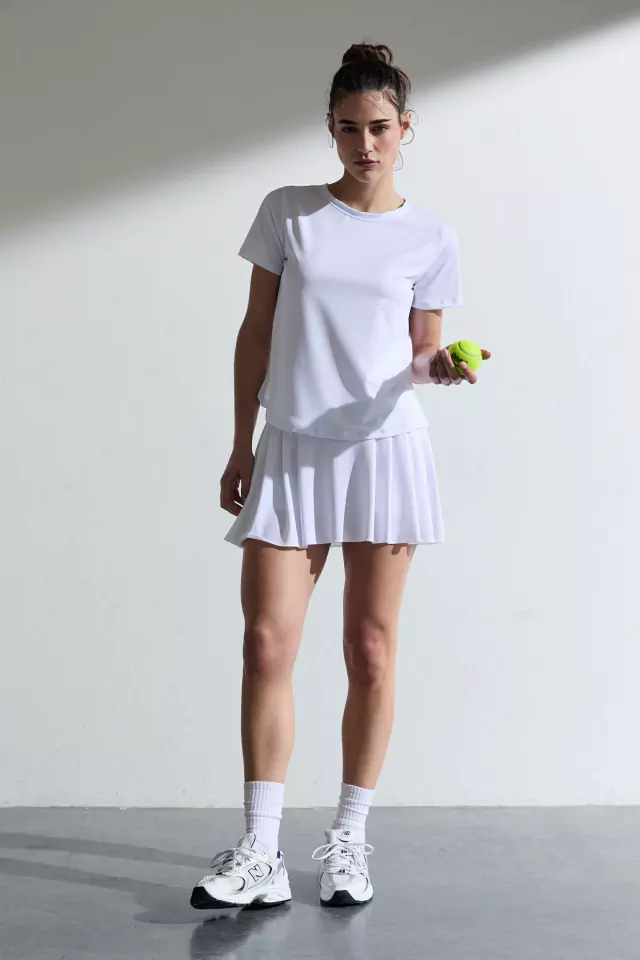 POLLERA CON TABLON CENTRAL Y TABLAS MAS PEQUEÑAS HACIA LOS LATERALES. CON CINTURA ALTA Y SHORT INTERNO. CONFECCIONADA EN DESAGUJADO. DETALLE DE ESTAMPACION CL.