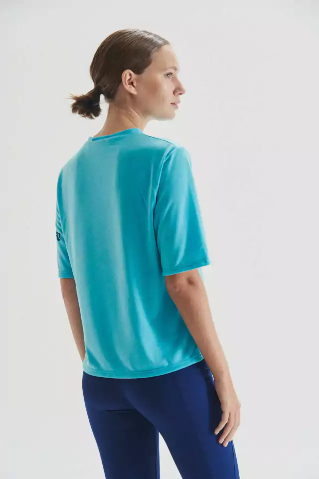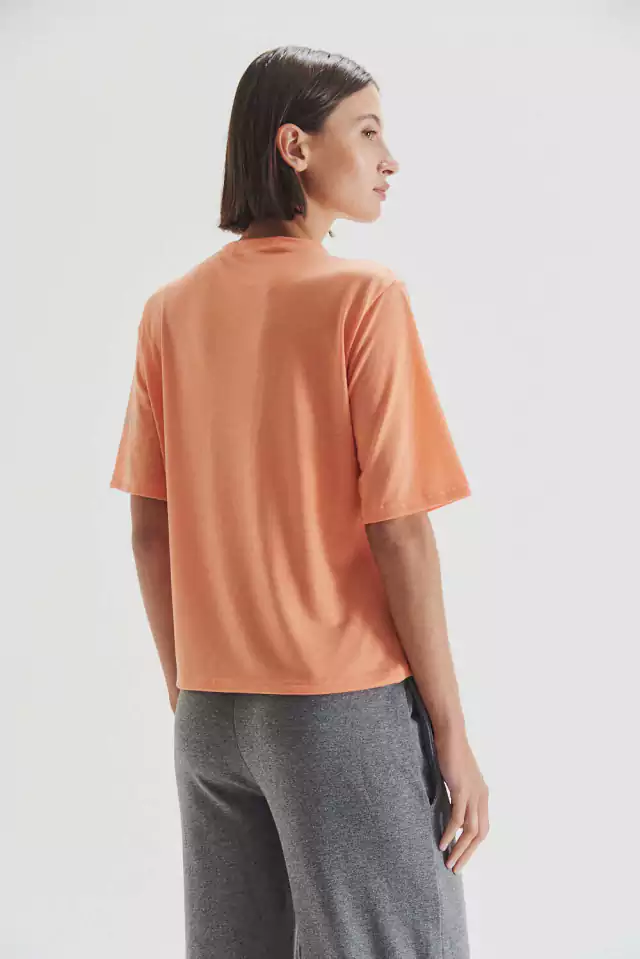 CAMISETA COZY AMPLIA CON CUELLO REDONDO Y MANGAS TRES CUARTOS. DETALLE DE ESTAMPACIÓN CLASS LIFE A CONTRATONO.