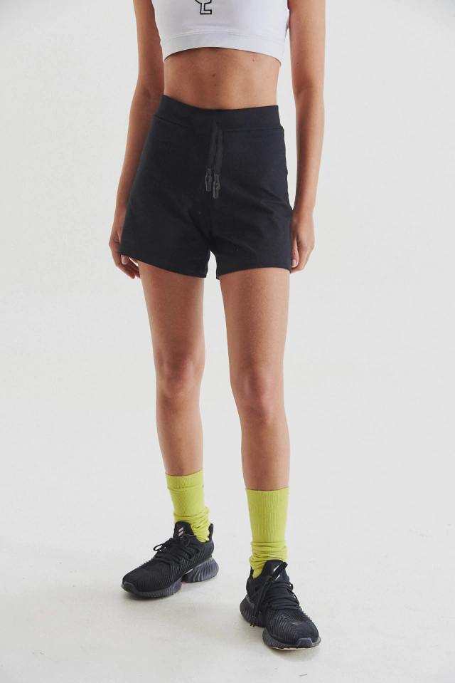 Short deportivo confeccionado con un tejido que permite la regulación de la temperatura del cuerpo. Tiro alto y con cintura ajustable con cordones.